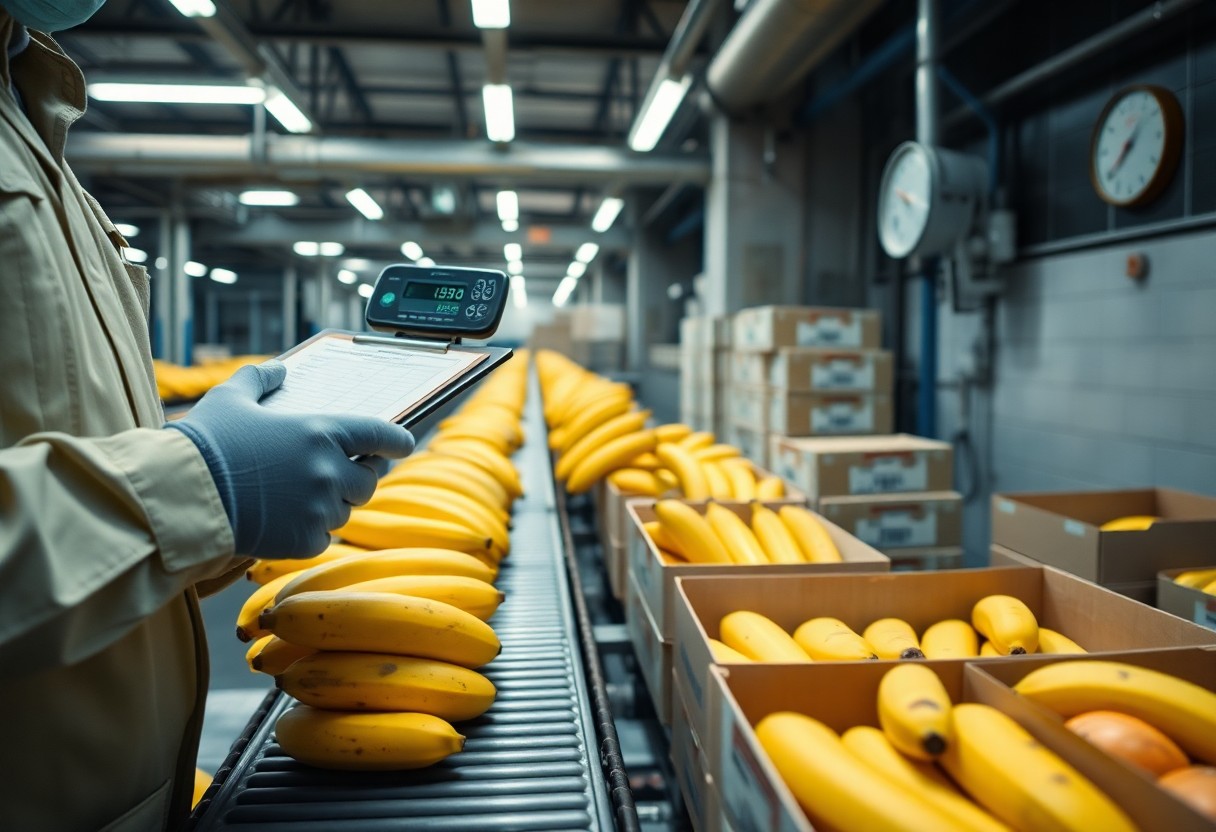 When you step into a packinghouse you’ll see bananas washed in chlorinated or ozone-treated water to cut fungal loads, then graded by diameter, curvature and visible defects; exporters typically pack into 40 lb (≈18 kg) boxes with liners and venting patterns to control airflow. Traceability tags, phytosanitary certificates and batch manifests travel with each pallet, and you should expect packinghouse rejection rates under 5% in well-run operations while poor sorting drives higher losses downstream.